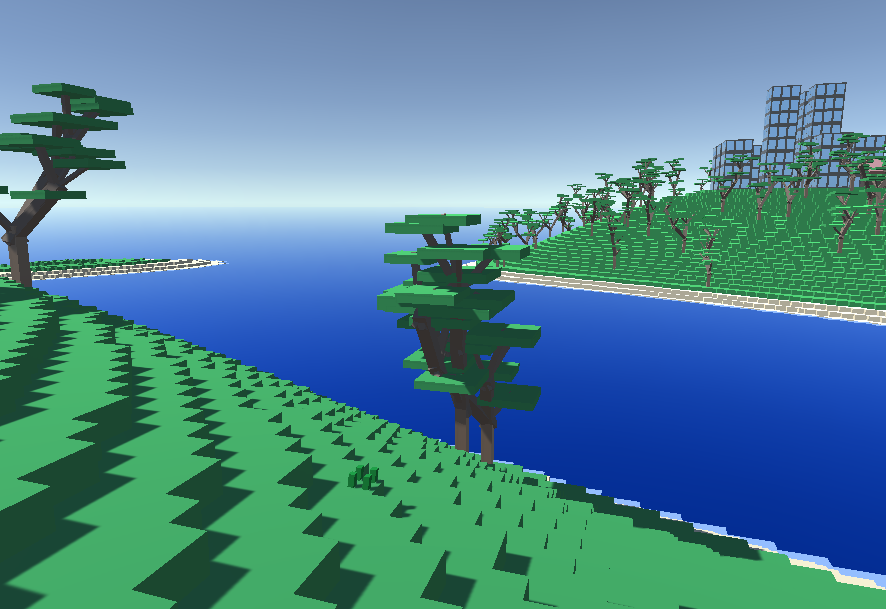 And the city, forming buildings out of prefabricated objects, placed with density according to the center of the city, all on flat ground determined by the system.